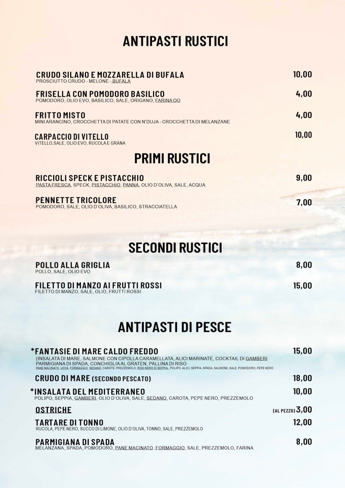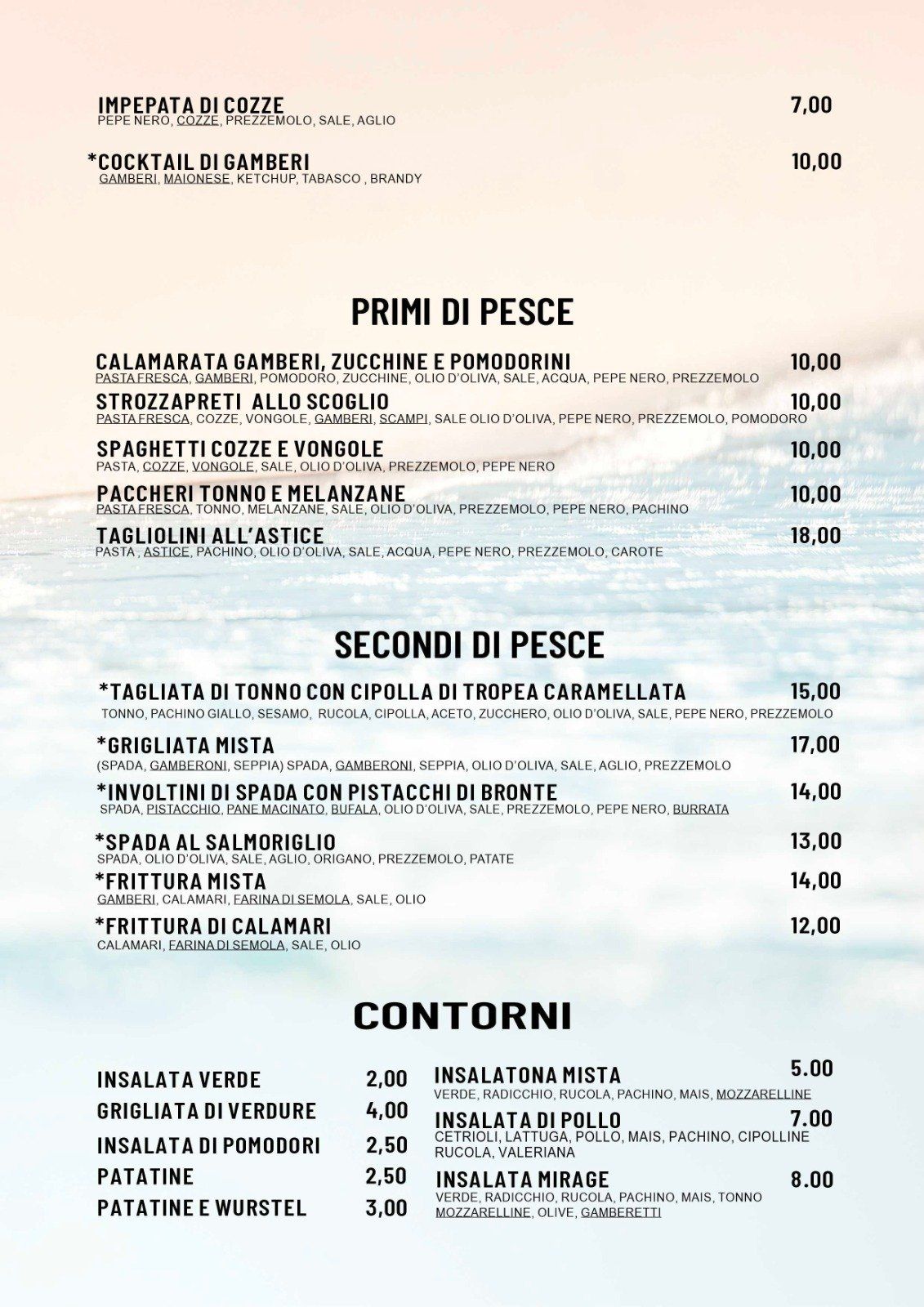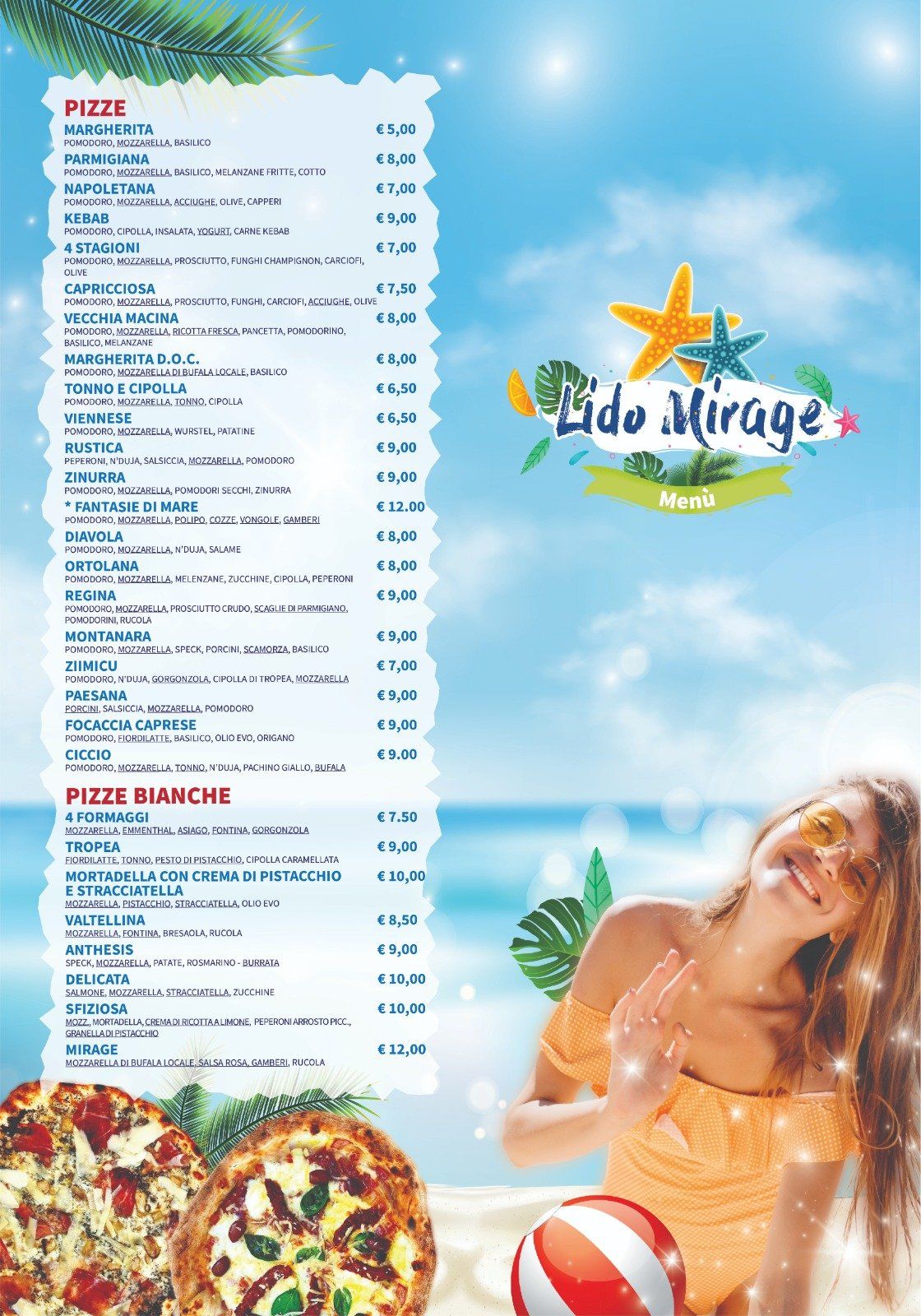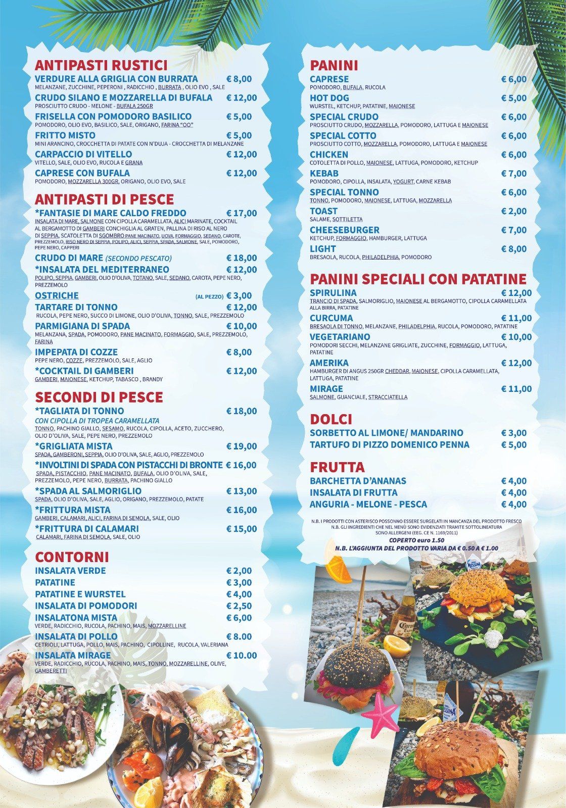 Il Lido Mirage offre alla propria clientela un menù ricco con specialità di pesce per farvi letteralmente leccare i baffi. Tutti i piatti menzionati nel menù sono realizzati con pescato sempre fresco e di qualità superiore, proponendo primi piatti con pasta fatta in casa e crostacei, grigliate di pesce misto, crostacei alla griglia, fritture di mare con calamari e gamberi, tartare di pesce fresco, carpaccio con misto mare e sapori originali e sorprendenti..... e tanto altro ancora.